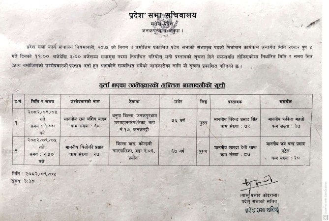 मधेस प्रदेशसभा सभामुख पदका लागि दुई उम्मेदवारको अन्तिम नामावली सार्वजनिक