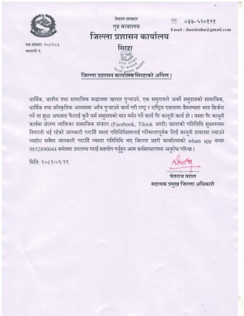 धार्मिक–सामाजिक सद्भाव बिगार्ने गतिविधि गैरकानूनी : जिल्ला प्रशासन कार्यालय सिरहा लाई सूचना दिनु