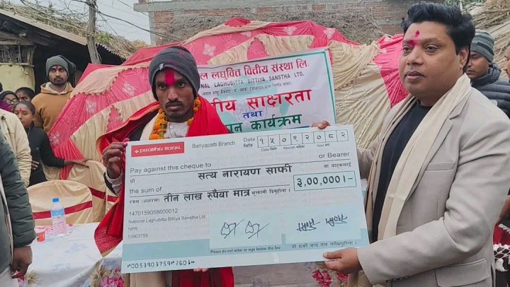 नेशनल लघुवित्तका CEO रामबहादुर यादवद्वारा संघर्षरत विद्यार्थी सत्यनारायण साफीलाई रु ३ लाख सहयोग